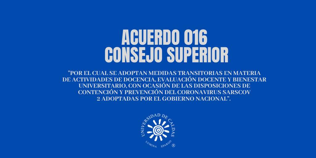 Mediante acuerdo 016 expedido por el Consejo Superior de la Universidad de Caldas se adoptan una serie de medidas transitorias en materia de actividades de docencia, evaluación docente y bienestar universitario, con ocasión de las disposiciones de contención y prevención del coronavirus SARSCoV-2 adoptadas por el Gobierno Nacional.