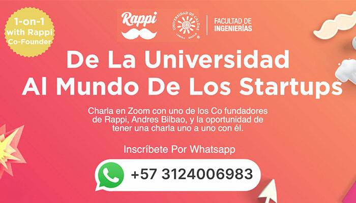 Este martes 28 de julio a las 6:30 pm, Andrés Bilbao, cofundador de Rappi, dará una charla sobre Tecnología y Emprendimiento “De la Universidad al Mundo de los StartUp”, orientada a estudiantes de la Facultad de Ingeniería de la Universidad de Caldas.