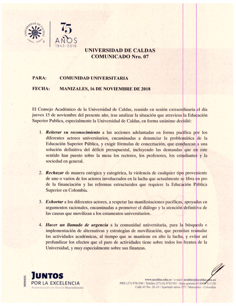 El Consejo Académico de la Universidad de Caldas, reunido en sesión extraordinaria el día jueves 15 de noviembre del presente año, tras analizar la situación que atraviesa la Educación Superior Publica, especialmente la Universidad de Caldas.