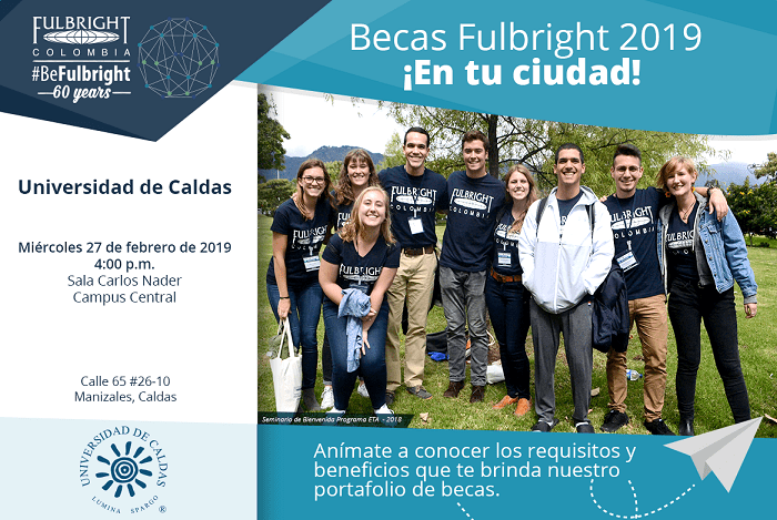 El próximo miércoles 27 de febrero a partir de las 4:00 p.m. en la Sala Carlos Náder Náder del Campus Central de la Universidad de Caldas, delegados del Programa Fullbright presentaran a la comunidad académica la oferta de becas que esta organización ofrece para 2019 para estudiar Maestrías y Doctorados en Estados Unidos.
