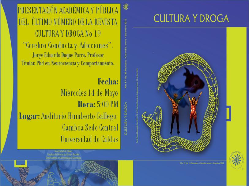 Cerebro, conductas y adicciones es el tema del último número de la Revista Cultura y Droga (número 19) de la Universidad de Caldas, que se presentará este miércoles 14 de mayo del 2014, a las 5:00 p.m. en la Sala Humberto Gallego Gamboa, Campus Central de la Institución.