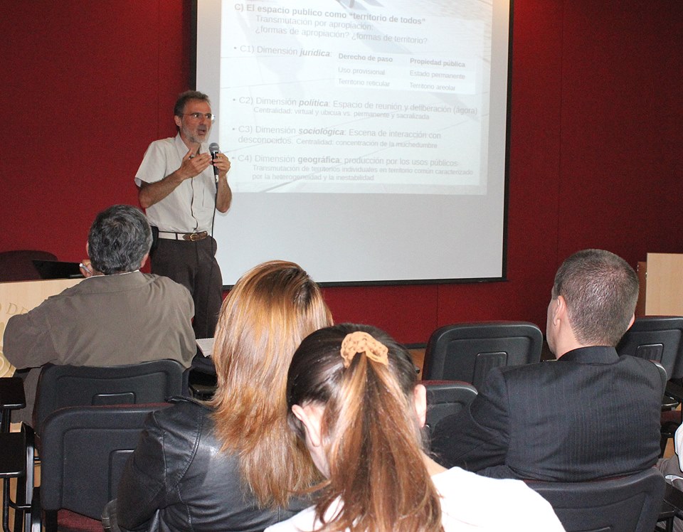 Jérôme Monnet, profesor de la U. de París Este y del Instituto Francés de Urbanismos (IFU), ubicado en París (Francia), orientó la conferencia central del acto, sobre espacio público y producción social del territorio.